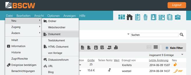 •Wählen Sie und dann einen Objekttyp aus der angebotenen Liste (Arbeitsbereich, Ordner, URL, Diskussionsforum, Umfrage, Aufgabe, Suchordner usw.), um ein Objekt des gewählten Typs direkt im BSCW-Server zu erzeugen.